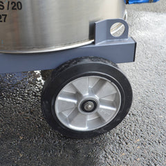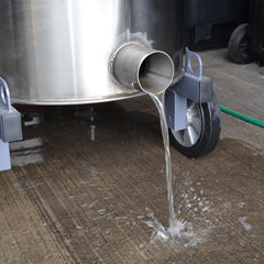 When the tank is full the vacuum will automatically shut down. Disconnect the wander hose and wheel the tank to the nearest drain / place and discharge the dirty water through the flexible lay-flat hose. This is a special design feature to make it easy to pass through the grid in a drain. For larger projects choose the optional automatic discharge pump package.  With this installed the tank will automatically discharge most of the water out through a hose pipe, leaving just the heavy sludge / debris  in the bottom of the tank.